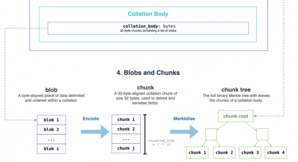 以下の図が示しているように、blobはchunkにまとめられ、chunkのマークルツリーによってルートが取られ、chunk rootがCollation headerに収められます。