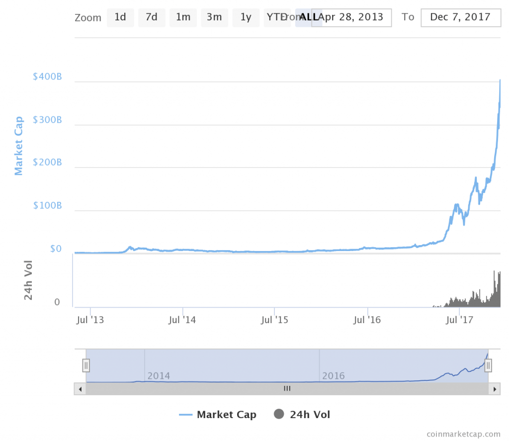 上の図では暗号通貨市場全体の時価総額は11月13日には2000億ドルで11月27日には3000億ドルになっています。ではこの2週間の間に1000億ドルのお金が法定通貨から暗号通貨に流れたということでしょうか?