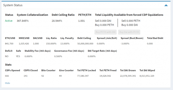 ロスカットが発生する証拠金維持率のようなものですね。担保資産のボラティリティをMKRホルダーが低く見積もっていれば、この値も低くなりそうです。 - Stability Fee(現在0.000%)